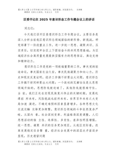 【七哥公文】2025年:区委书记在2025年意识形态工作专题会议上的讲话+更多免费公文+VX:QiGeGongWen2024
