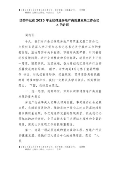 【七哥公文】2025年:区委书记在2025年全区推进房地产高质量发展工作会议上的讲话+更多免费公文+VX:QiGeGongWen2024
