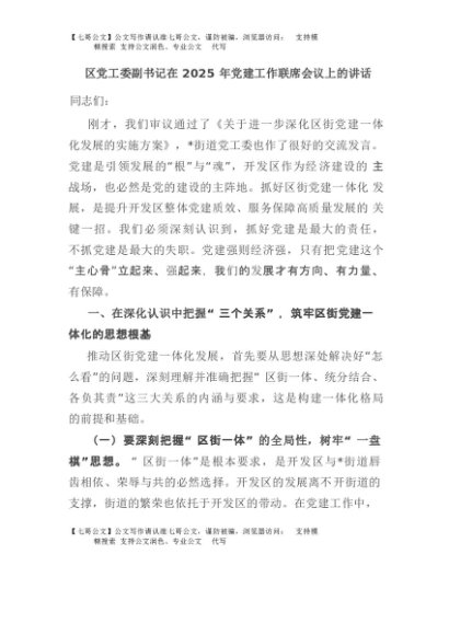 【七哥公文】2025年:区党工委副书记在2025年党建工作联席会议上的讲话+更多免费公文+VX:QiGeGongWen2024