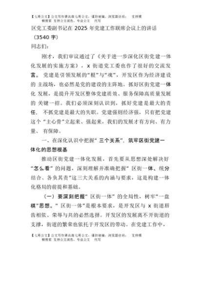 【七哥公文】2025年:区党工委副书记在2025年党建工作联席会议上的讲话(3540字)+更多免费公文+VX:QiGeGongWen2024