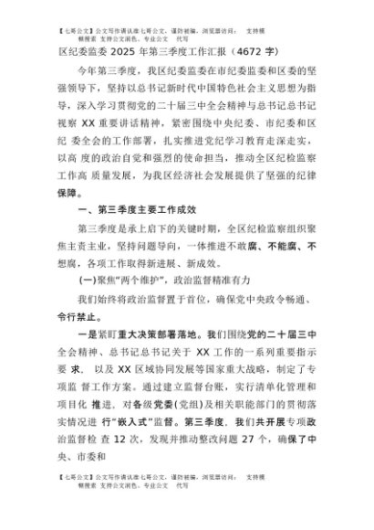 【七哥公文】2025年:区纪委监委2025年第三季度工作汇报(4672字)+更多免费公文+VX:QiGeGongWen2024