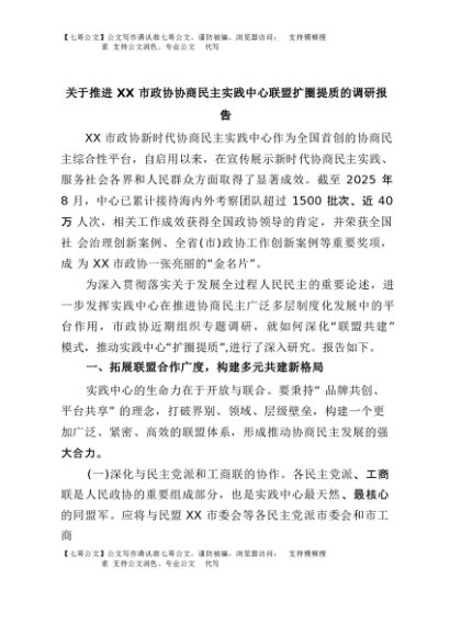 【七哥公文】2025年:关于推进XX市政协协商民主实践中心联盟扩圈提质的调研报告+更多免费公文+VX:QiGeGongWen2024