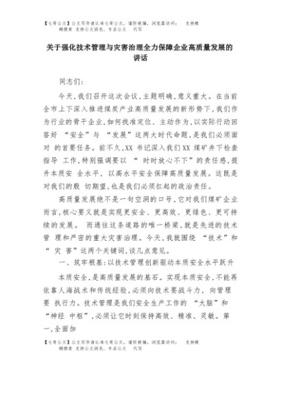 【七哥公文】2025年:关于强化技术管理与灾害治理全力保障企业高质量发展的讲话+更多免费公文+VX:QiGeGongWen2024
