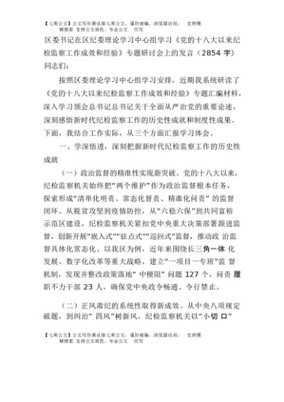 【七哥公文】2025年:区委书记在区纪委理论学习中心组学习《党的十八大以来纪检监察工作成效和经验》专题研讨会上的发言(2854字)+更多免费公文+VX:QiGeGongWen2024