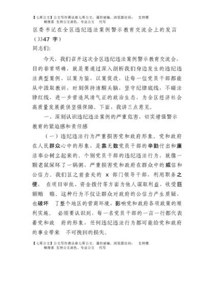 【七哥公文】2025年:区委书记在全区违纪违法案例警示教育交流会上的发言(3347字)+更多免费公文+VX:QiGeGongWen2024