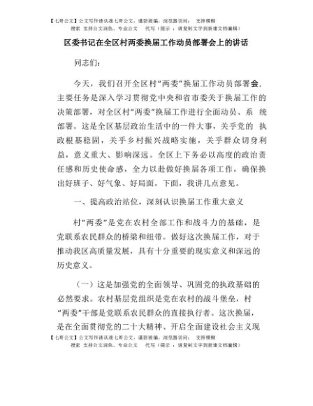 / 【七哥公文】2025年:区委书记在全区村两委换届工作动员部署会上的讲话+更多免费公文+VX:QiGeGongWen2024