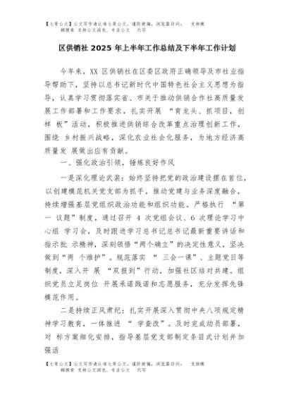 【七哥公文】2025年:区供销社2025年上半年工作总结及下半年工作计划+更多免费公文+VX:QiGeGongWen2024