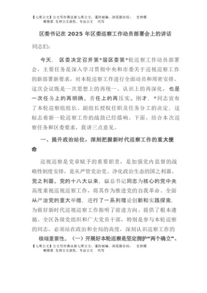 【七哥公文】2025年:区委书记在2025年区委巡察工作动员部署会上的讲话+更多免费公文+VX:QiGeGongWen2024
