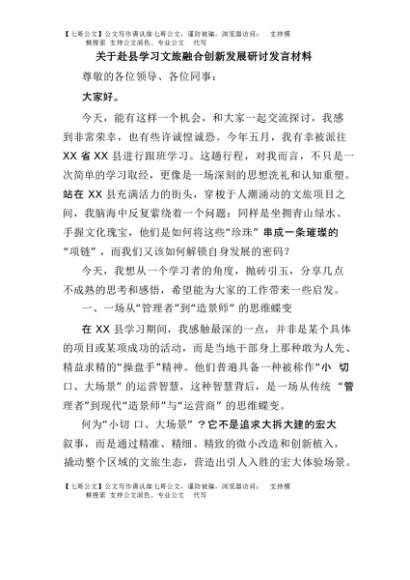 / 【七哥公文】2025年:关于赴县学习文旅融合创新发展研讨发言材料+更多免费公文+VX:QiGeGongWen2024