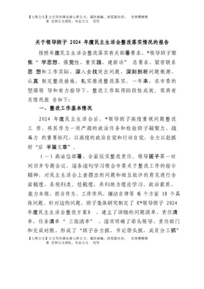 【七哥公文】2025年:关于领导班子2024年度民主生活会整改落实情况的报告+更多免费公文+VX:QiGeGongWen2024