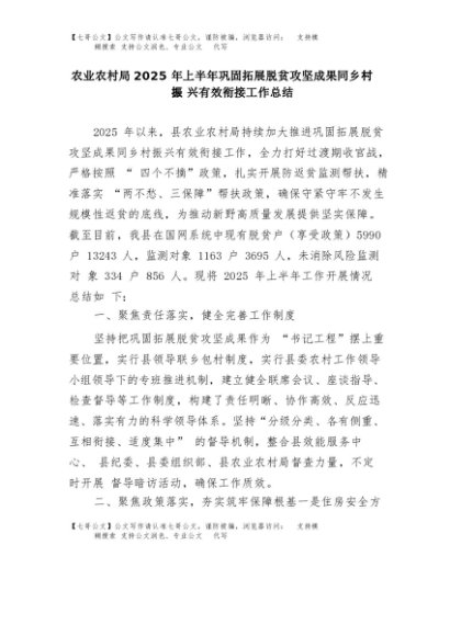 【七哥公文】2025年:农业农村局2025年上半年巩固拓展脱贫攻坚成果同乡村振兴有效衔接工作总结+更多免费公文+VX:QiGeGongWen2024