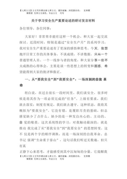 【七哥公文】2025年:关于学习安全生产重要论述的研讨发言材料+更多免费公文+VX:QiGeGongWen2024