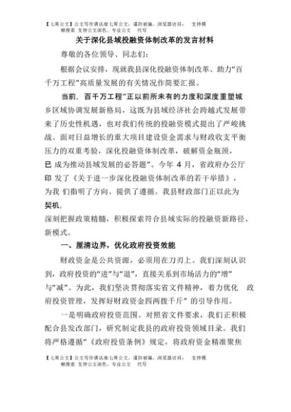 / 【七哥公文】2025年:关于深化县域投融资体制改革的发言材料+更多免费公文+VX:QiGeGongWen2024