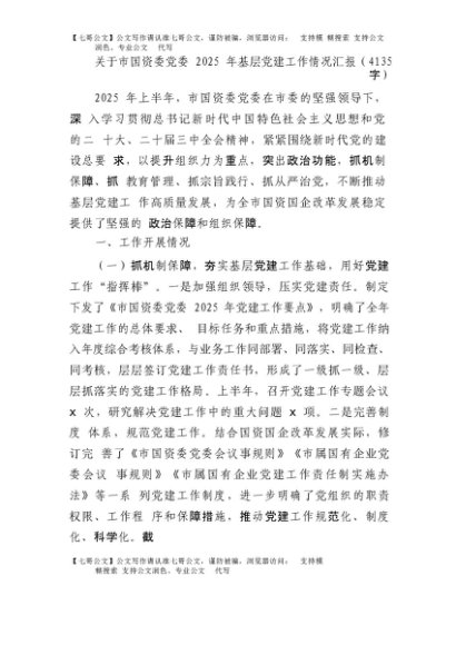 【七哥公文】2025年:关于市国资委党委2025年基层党建工作情况汇报(4135字)+更多免费公文+VX:QiGeGongWen2024