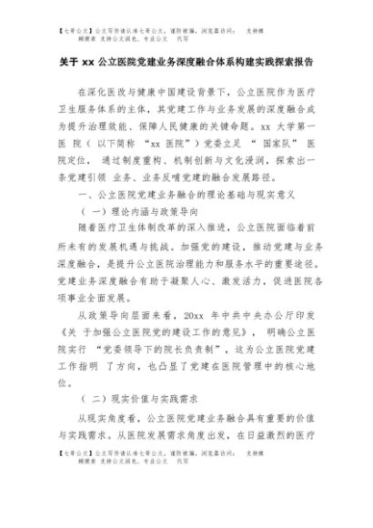 【七哥公文】2025年:关于xx公立医院党建业务深度融合体系构建实践探索报告+更多免费公文+VX:QiGeGongWen2024