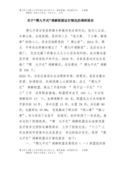 / 【七哥公文】2025年:关于“樊九平式”调解联盟运行情况的调研报告+更多免费公文+VX:QiGeGongWen2024