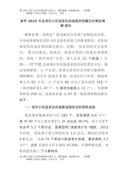 【七哥公文】2025年:关于2025年县老旧小区适老化改造现存问题及对策的调研报告+更多免费公文+VX:QiGeGongWen2024