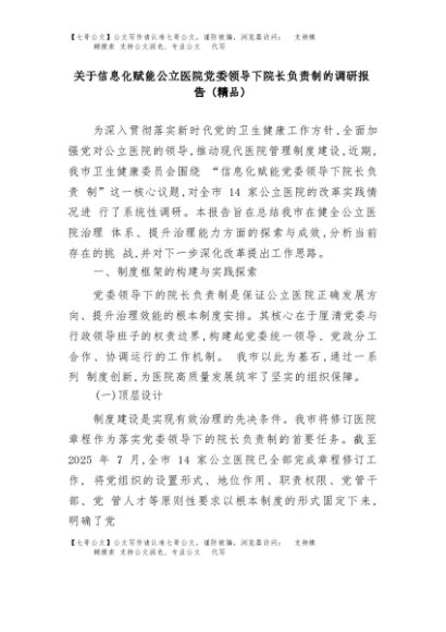 【七哥公文】2025年:关于信息化赋能公立医院党委领导下院长负责制的调研报告(精品)+更多免费公文+VX:QiGeGongWen2024