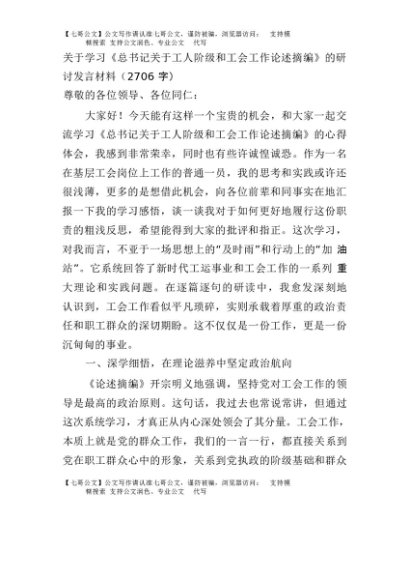 【七哥公文】2025年:关于学习《总书记关于工人阶级和工会工作论述摘编》的研讨发言材料(2706字)+更多免费公文+VX:QiGeGongWen2024