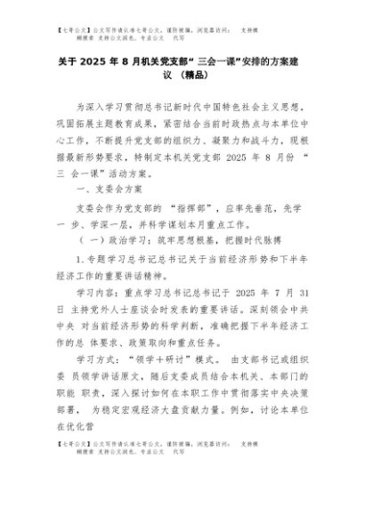【七哥公文】2025年:关于2025年8月机关党支部“三会一课”安排的方案建议(精品)+更多免费公文+VX:QiGeGongWen2024