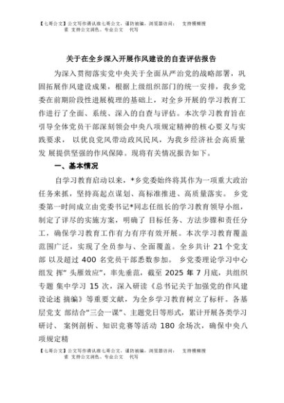 【七哥公文】2025年:关于在全乡深入开展作风建设的自查评估报告+更多免费公文+VX:QiGeGongWen2024