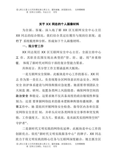 【七哥公文】2025年:关于XX同志的个人画像材料+更多免费公文+VX:QiGeGongWen2024