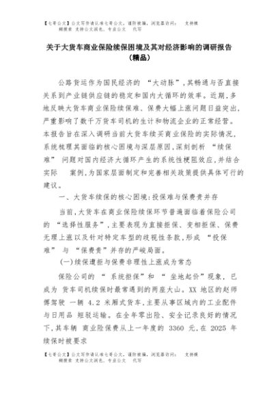 【七哥公文】2025年:关于大货车商业保险续保困境及其对经济影响的调研报告(精品)+更多免费公文+VX:QiGeGongWen2024