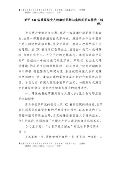 【七哥公文】2025年:关于XX省重要党史人物廉洁思想与实践的研究报告(精品)+更多免费公文+VX:QiGeGongWen2024
