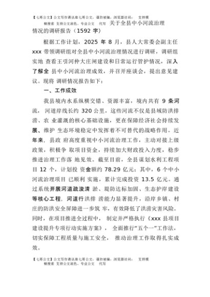 【七哥公文】2025年:关于全县中小河流治理情况的调研报告(1592字)+更多免费公文+VX:QiGeGongWen2024