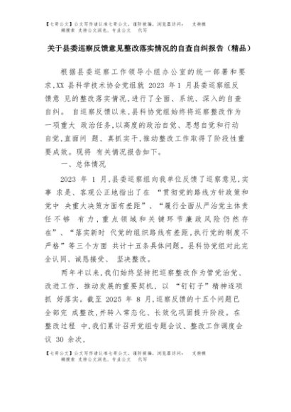 【七哥公文】2025年:关于县委巡察反馈意见整改落实情况的自查自纠报告(精品)+更多免费公文+VX:QiGeGongWen2024