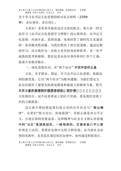 【七哥公文】2025年:关于学习总书记文化思想的研讨发言材料(2599字)+更多免费公文+VX:QiGeGongWen2024