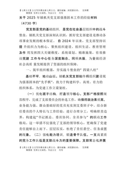 【七哥公文】2025年:关于2025年镇机关党支部强基固本工作的经验材料(4730字)+更多免费公文+VX:QiGeGongWen2024