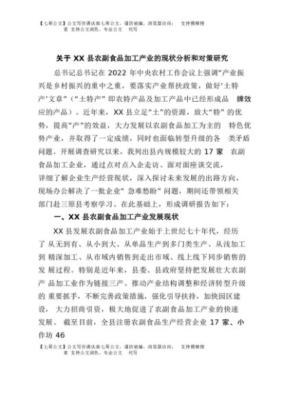 / 【七哥公文】2025年:关于XX县农副食品加工产业的现状分析和对策研究+更多免费公文+VX:QiGeGongWen2024
