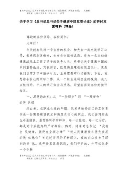 【七哥公文】2025年:关于学习《总书记关于健康中国重要论述》的研讨发言材料(精品)+更多免费公文+VX:QiGeGongWen2024