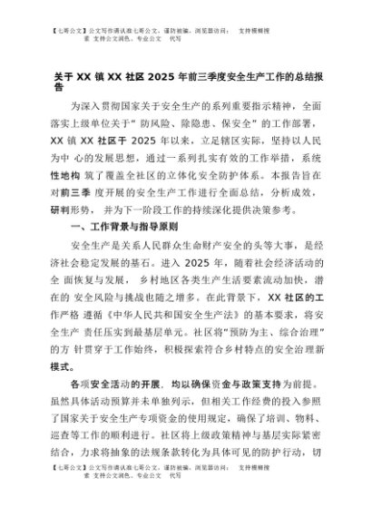 【七哥公文】2025年:关于XX镇XX社区2025年前三季度安全生产工作的总结报告+更多免费公文+VX:QiGeGongWen2024