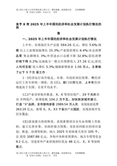 【七哥公文】2025年:关于X市2025年上半年国民经济和社会发展计划执行情况的报告+更多免费公文+VX:QiGeGongWen2024