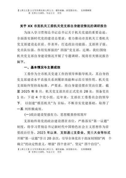 【七哥公文】2025年:关于XX市直机关工委机关党支部自身建设情况的调研报告+更多免费公文+VX:QiGeGongWen2024