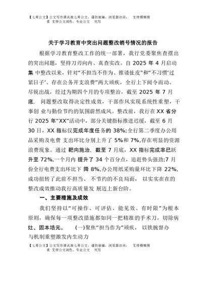 / 【七哥公文】2025年:关于学习教育中突出问题整改销号情况的报告+更多免费公文+VX:QiGeGongWen2024
