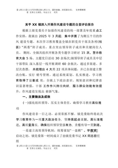 / 【七哥公文】2025年:关于XX镇深入开展作风建设专题的自查评估报告+更多免费公文+VX:QiGeGongWen2024