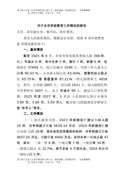 / 【七哥公文】2025年:关于全市学前教育工作情况的报告+更多免费公文+VX:QiGeGongWen2024