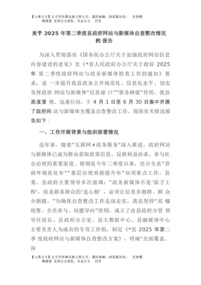 【七哥公文】2025年:关于2025年第二季度县政府网站与新媒体自查整改情况的报告+更多免费公文+VX:QiGeGongWen2024