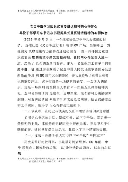 / 【七哥公文】2025年:党员干部学习阅兵式重要讲话精神的心得体会+更多免费公文+VX:QiGeGongWen2024