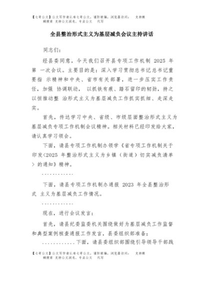/ 【七哥公文】2025年:全县整治形式主义为基层减负会议主持讲话+更多免费公文+VX:QiGeGongWen2024