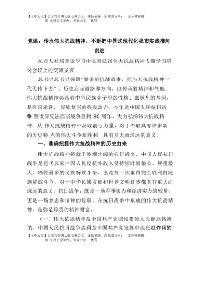 【七哥公文】2025年:党课:传承伟大抗战精神,不断把中国式现代化我市实践推向前进+更多免费公文+VX:QiGeGongWen2024