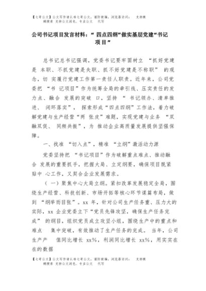 【七哥公文】2025年:公司书记项目发言材料:“四点四纲”做实基层党建“书记项目”+更多免费公文+VX:QiGeGongWen2024