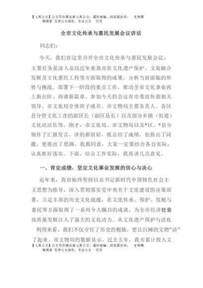 / 【七哥公文】2025年:全市文化传承与惠民发展会议讲话+更多免费公文+VX:QiGeGongWen2024