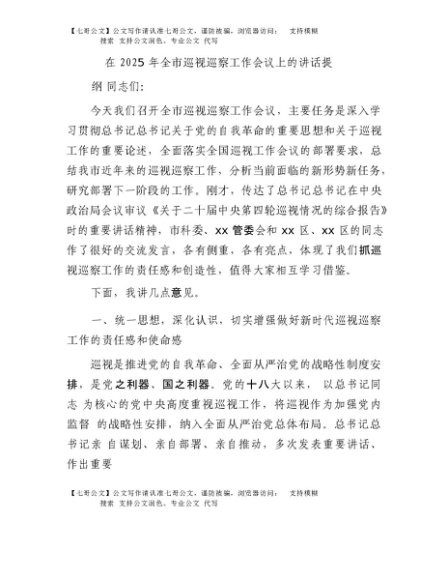 / 【七哥公文】2025年:全市巡视(巡察)工作会议上的讲话提纲+更多免费公文+VX:QiGeGongWen2024