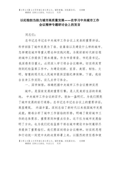 【七哥公文】2025年:以纪检担当助力城市高质量发展——在学习中央城市工作会议精神专题研讨会上的发言+更多免费公文+VX:QiGeGongWen2024