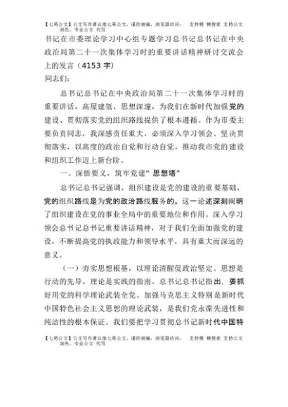 【七哥公文】2025年:书记在市委理论学习中心组专题学习总书记总书记在中央政治局第二十一次集体学习时的重要讲话精神研讨交流会上的发言(4153字)+更多免费公文+VX:QiGeGongWen2024