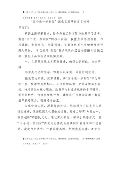/ 【七哥公文】2025年:五个进一步到位深化实践研讨发言材料+更多免费公文+VX:QiGeGongWen2024